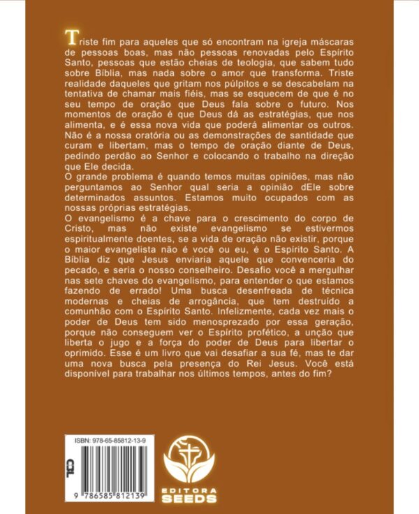 O evangelismo é a chave para o crescimento do corpo de Cristo, mas não existe evangelismo se estivermos espiritualmente doentes, se a vida de oração não existir, porque o maior evangelista não é você ou eu, é o Espírito Santo. A Bíblia diz que Jesus enviaria aquele que convenceria do pecado, e seria o nosso conselheiro. Desafio você a mergulhar nas sete chaves do evangelismo, para entender o que estamos fazendo de errado! Uma busca desenfreada de técnica modernas e cheias de arrogância, que tem destruído a comunhão com o Espírito Santo. Infelizmente, cada vez mais o poder de Deus tem sido menosprezado por essa geração, porque não conseguem ver o Espírito profético, a unção que liberta o jugo e a força do poder de Deus para libertar o oprimido. Esse é um livro que vai desafiar a sua fé, mas te dar uma nova busca pela presença do Rei Jesus. Você está disponível para trabalhar nos últimos tempos, antes do fim?