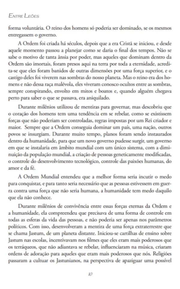 Não se sabe o motivo de tanta ânsia por poder, mas aqueles que dominam dentro da Ordem são imortais, foram presos aqui na terra por toda a eternidade, acredita-se que eles foram banidos de outras dimensões por uma força superior, e o castigo deles foi viverem nas sombras do nosso planeta. Mas o reino era dos homens e não dessa raça malévola, eles viveram conosco ocultos entre as sombras, sempre conspirando, envolto em mitos e boatos e, quando alguém chegava perto para saber o que se passava, era aniquilado. Durante milênios utilizou de mentiras para governar, mas descobriu que o coração dos homens tem uma tendência em se rebelar, como se existissem forças que não poderiam ser controladas, regras impostas por um Rei criador e maior.