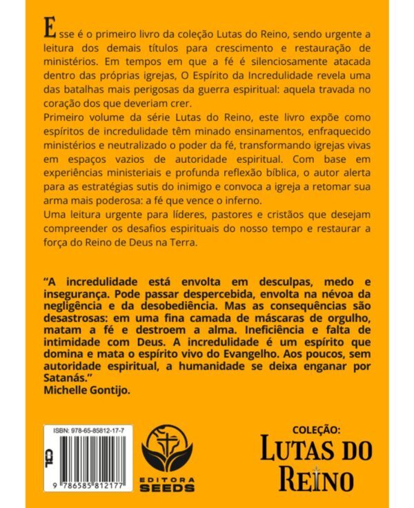 Esse é o primeiro livro da coleção Lutas do Reino, sendo urgente a leitura dos demais títulos para crescimento e restauração de ministérios. Em tempos em que a fé é silenciosamente atacada dentro das próprias igrejas, O Espírito da Incredulidade revela uma das batalhas mais perigosas da guerra espiritual: aquela travada no coração dos que deveriam crer.